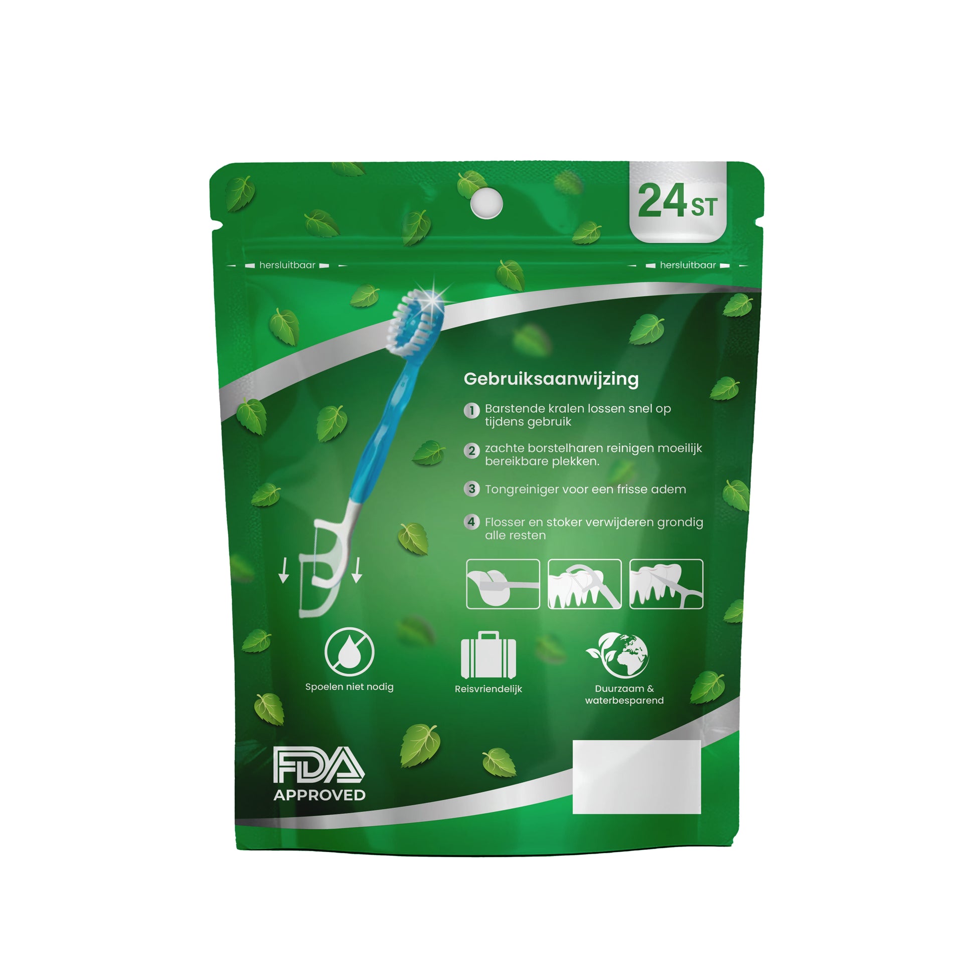 De Swish combineert tandenborstel, tandpasta, tongreiniger, flosser en tandenstoker in één compacte tool. Gewoon uitpakken, poetsen zonder water, en klaar – ideaal voor onderweg!